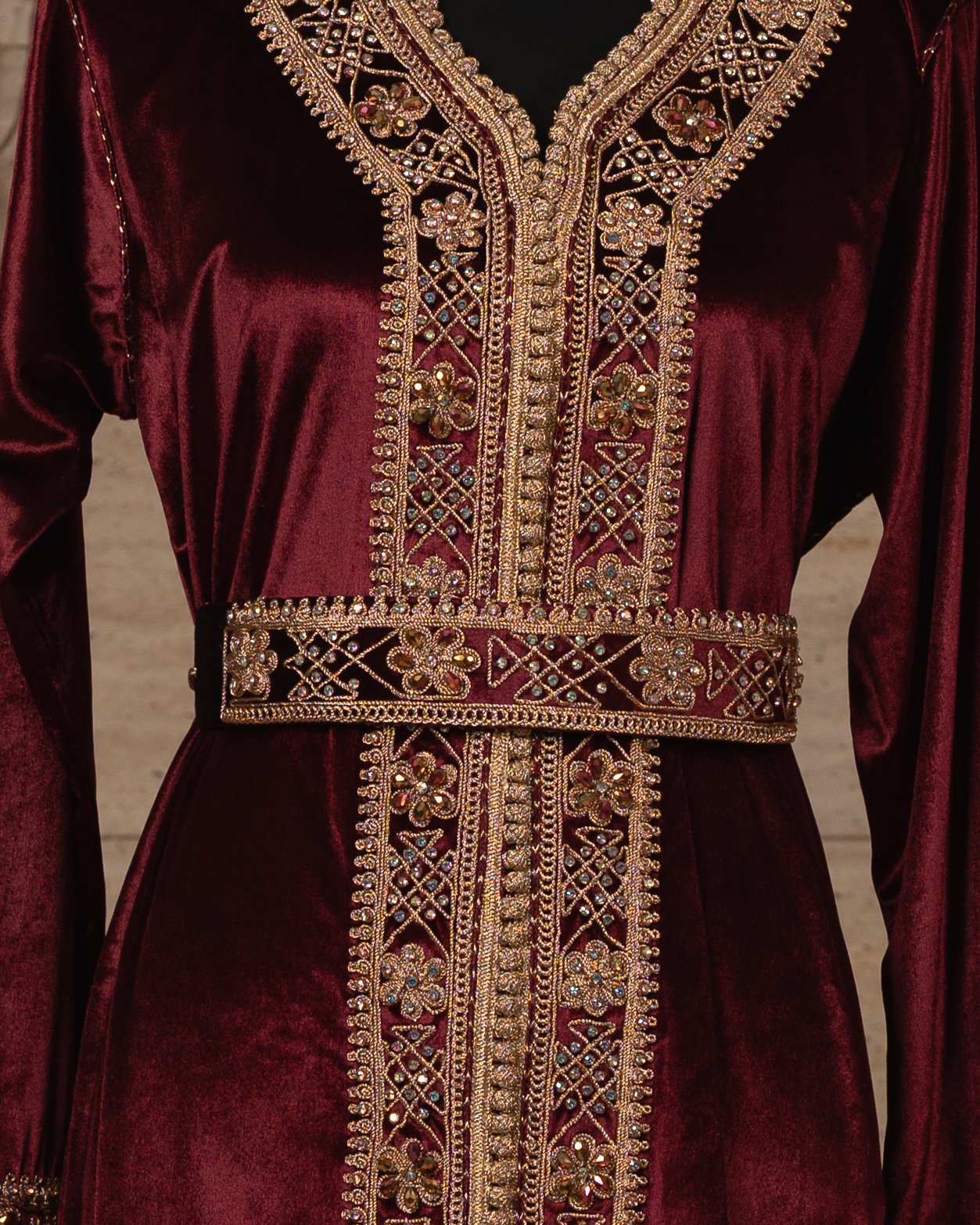 لباس مُطرّز يدويًا مكوّن من قطعتين، ثوب وحزام، يُعبّر عن فن اللباس المغربي