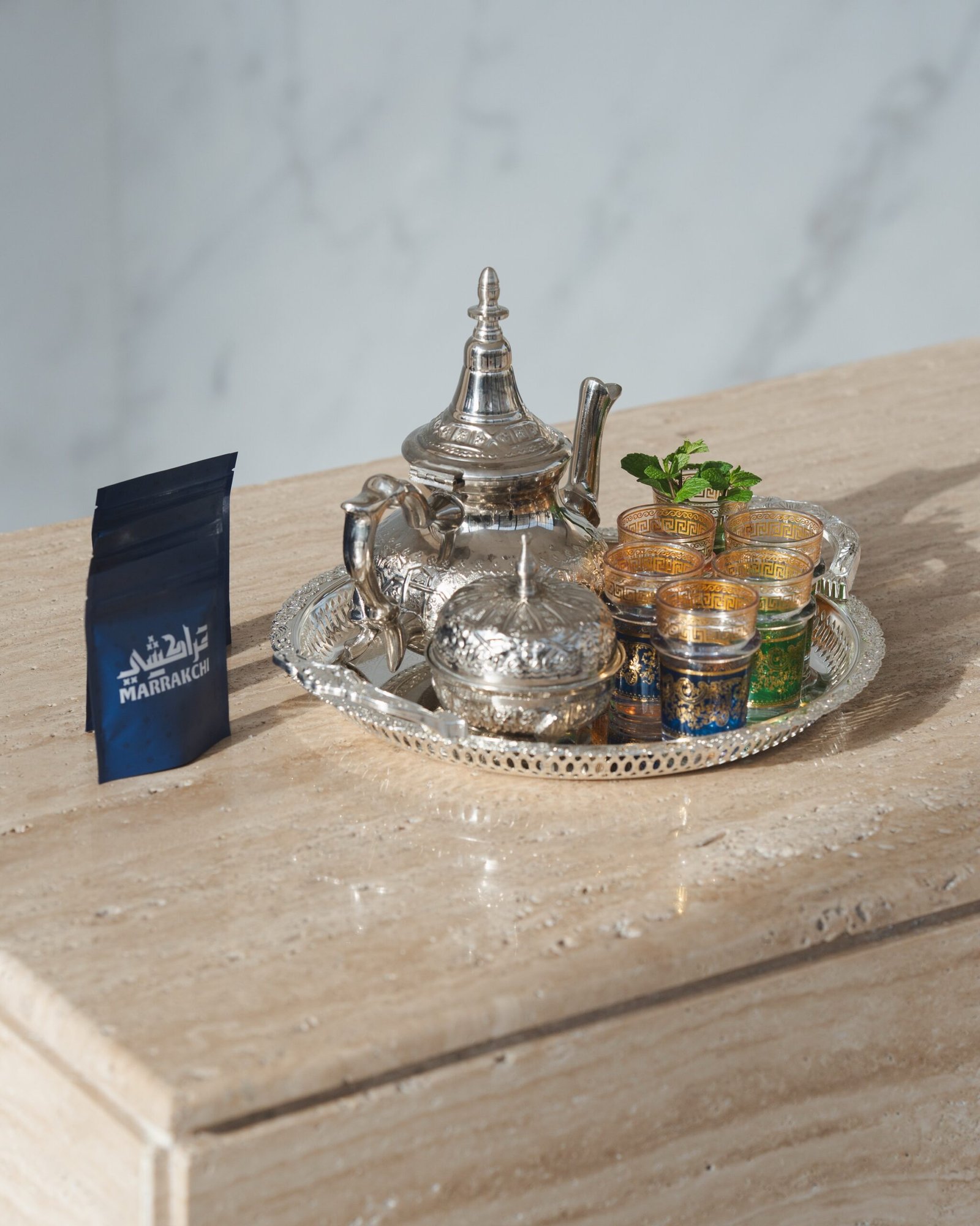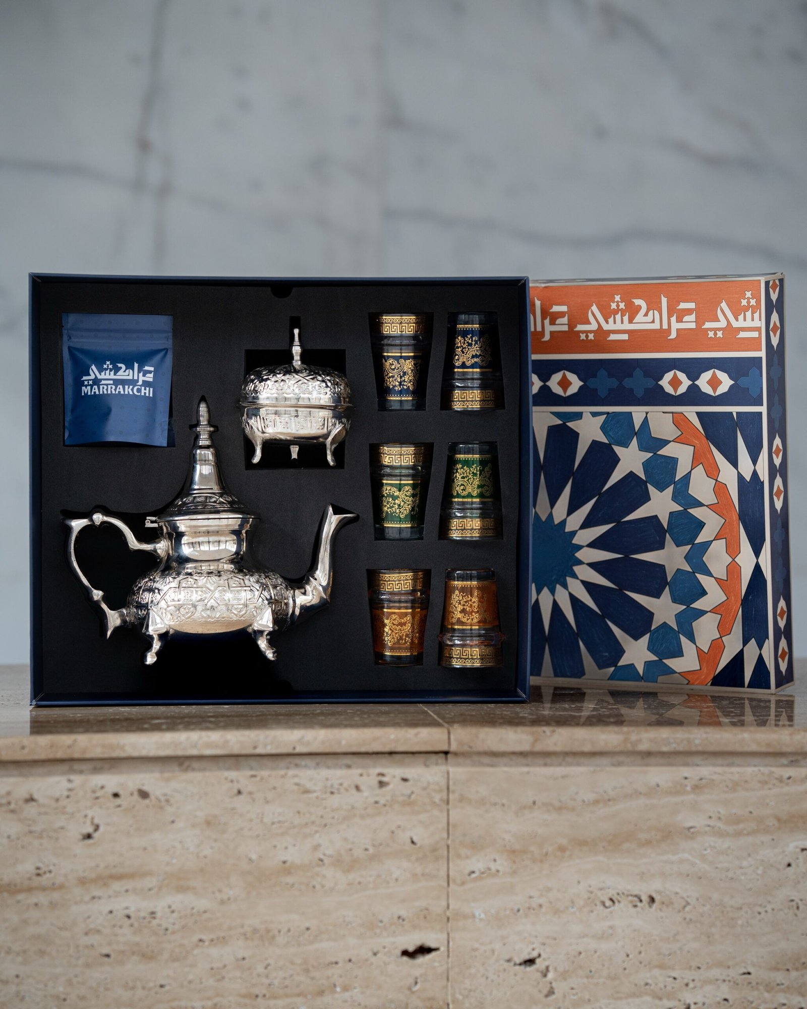 يتكون من: غوري فضي ١،٢٥٠ لتر، ٦ كاسات ملونة، صينية فضية، وأكياس من الشاي المغربي الفاخر